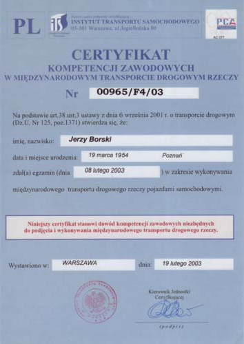 From the beginning of year 2007 taking care about high quality services, we have started the implementation of quality management system ISO 9001:2000. Our transportation accomplishes on the basis Community Licence, according to legislation of CMR convention and we protect the flote by OCP police in international and domestic movement. Our personell staff possess Certificates of Proffesional Competence In the International Road Transport.